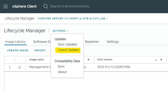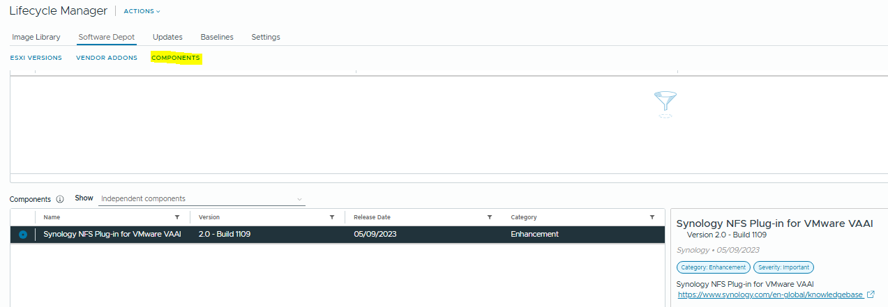 Step 1: Log into vCenter, browser to Lifecycle Manager and we’ll upload the Synology VIB