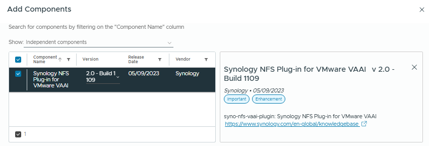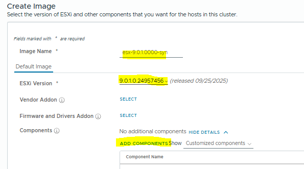 Give the image a name, select the ESX build that matches the VCF BOM you’ll be deploying, and click “Add Components”