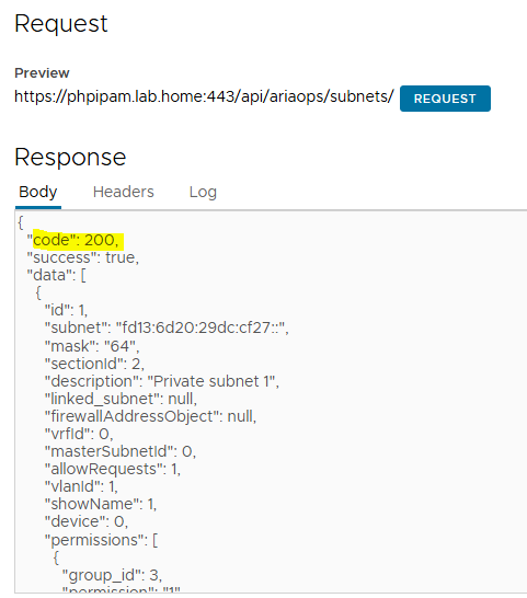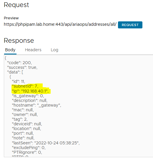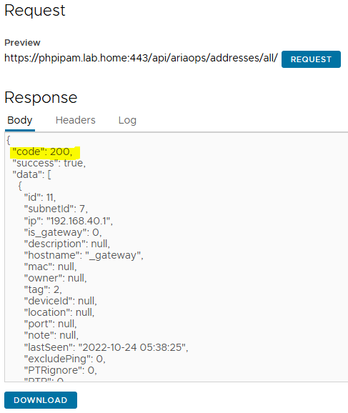 Test the request again, we should get HTTP 200 and a list of all allocated IP addresses from phpIPAM.