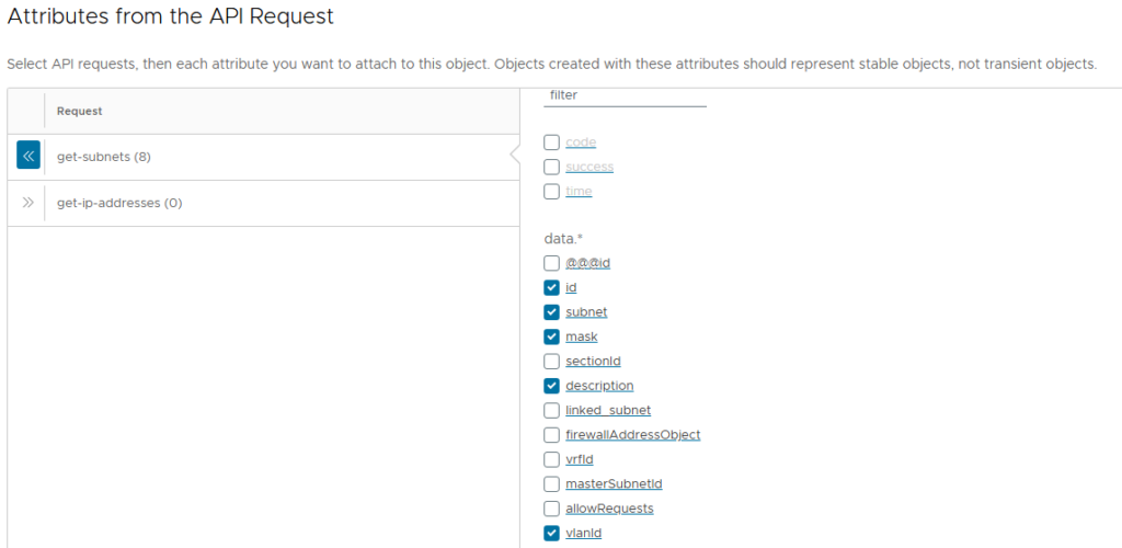 I’ve selected id, subnet, mask, description, vlanId, isFull, location and lastScan.
