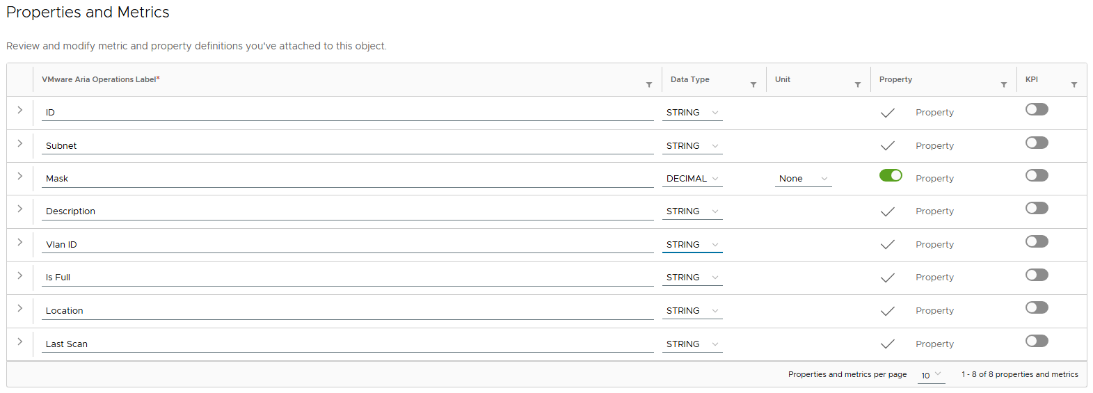 I’ve configured them all as Strings as they are static properties, except for Subnet Mask as I’ll need to use this in a mathematical supermetric later to calculate how full the subnet is – we’ll need it to be a numeric type.