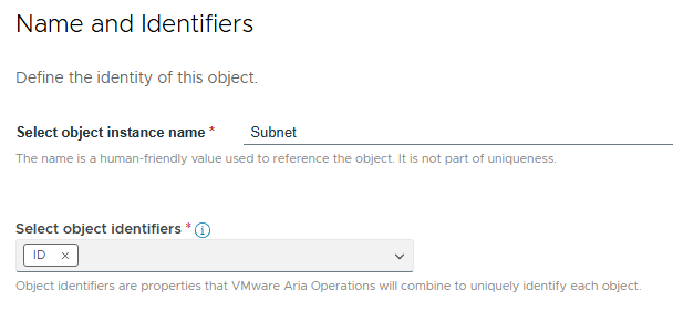 On the last screen, we’ll configure the naming and identifiers. I’ve selected the “Subnet” field to be the object instance name which will show up in Aria Operations, and ID as the unique identifier as this is how the subnet is recorded in the phpIPAM database. Note – the object identifier must be a “STRING” type or you cannot select it.