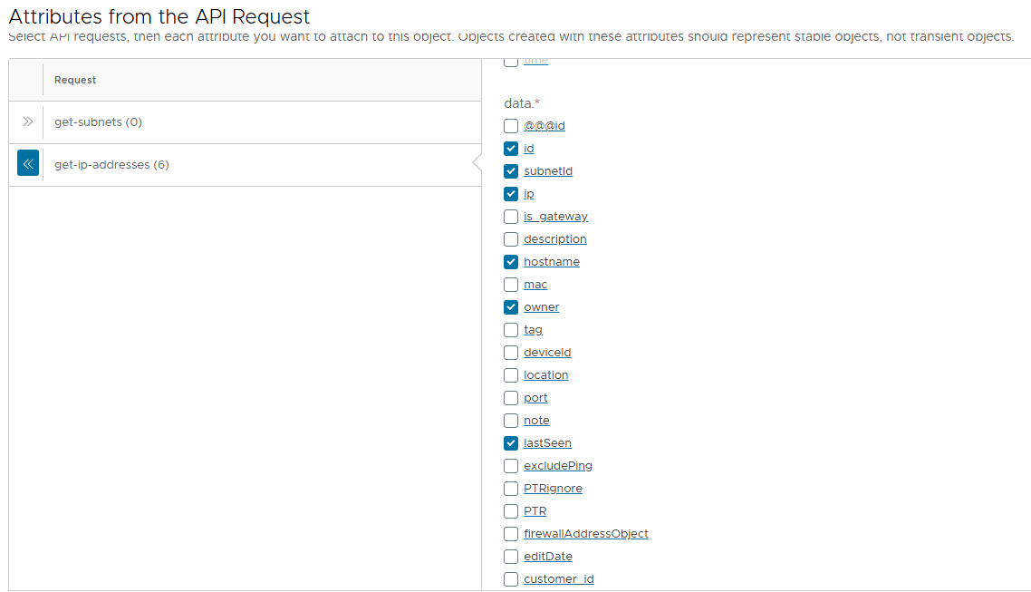 The extracted fields will be displayed on the next page when we select the request type. Here we select which fields we want to bring into Aria Ops.