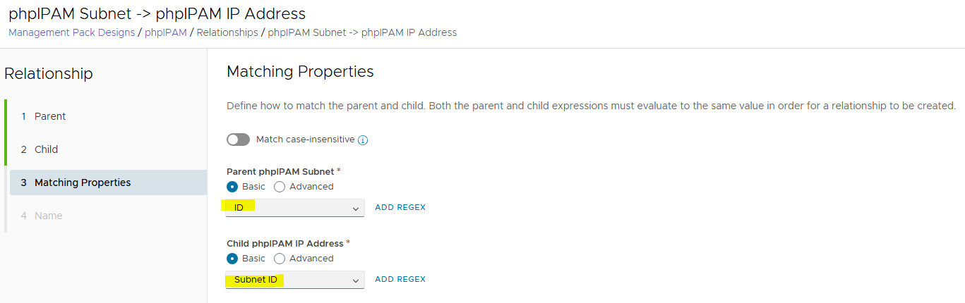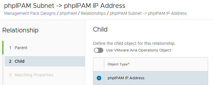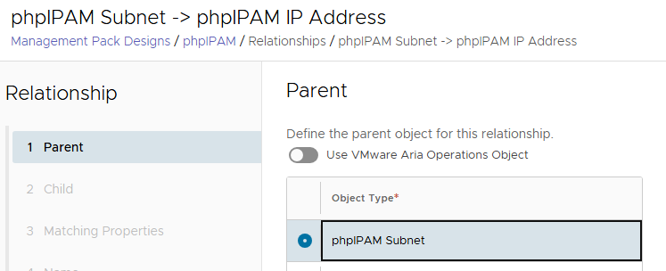 I’m also going to create another relationship using some default Aria Ops fields. I want to link a Parent VM to the Child phpIPAM IP Address object.