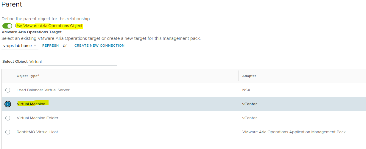 Create a new relationship, but this time we’ll select a Aria Operations Object as the parent. Search for Virtual Machine and we can pick the attribute to link.