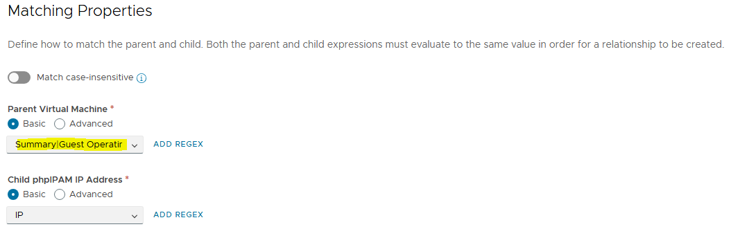 Now we select the matching properties – Parent Summary|Guest Operating System|Guest OS IP Address -> Child IP Address