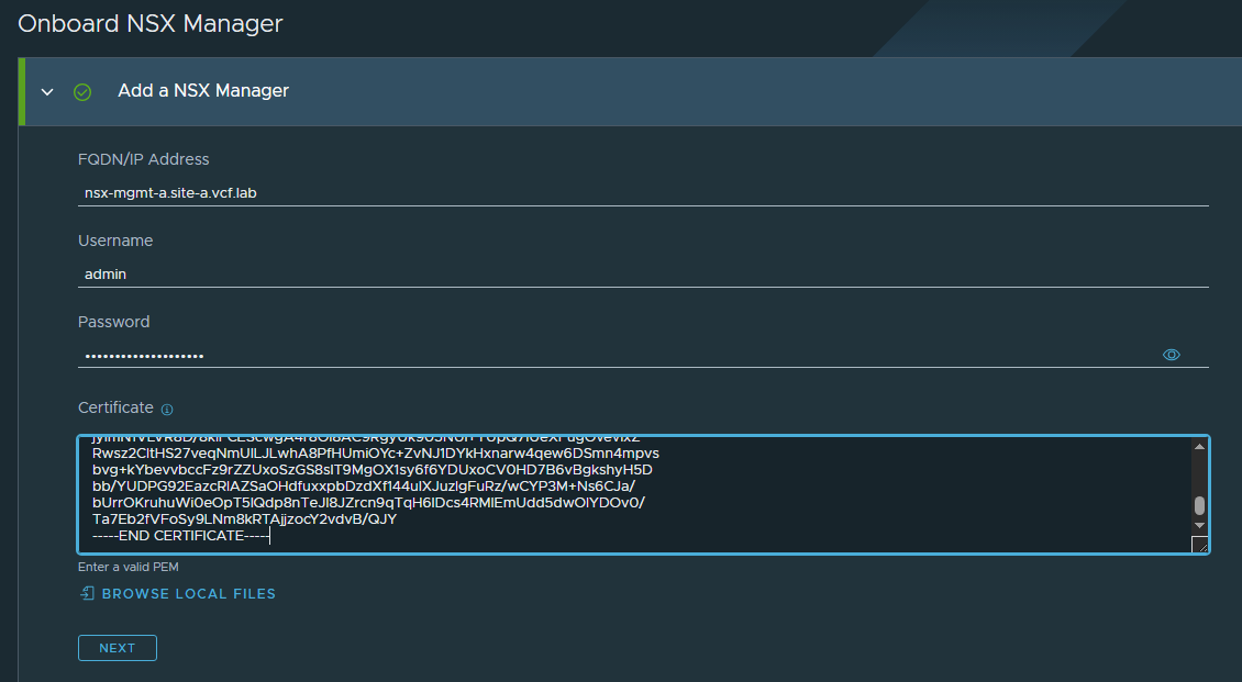 We will be immediately prompted to onboard an NSX Manager. This demo will be for MGMT domain only, but the SSP platform can be shared between multiple WLD domains, if they are running a shared NSX Instance. Otherwise it’s a 1-1 mapping for NSX Manager -> SSP Platform.